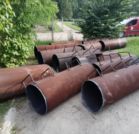 Šovasar demontēti savu laiku nokalpojušie, lielie metāla skursteņi katlumājai Padurē un Jelgavas ielā 38, Kuldīgā.