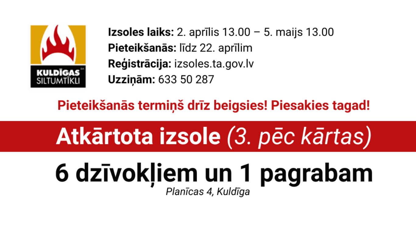 SIA "Kuldīgas siltumtīkli" organizē atkārtotu (3. pēc kārtas) elektronisku izsoli ar augšupejošu soli 6 atsevišķiem dzīvokļiem un 1 pagraba telpai. Izsoles periods no 2026. gada 2. aprīļa 13.00 līdz 5. maija 13.00.