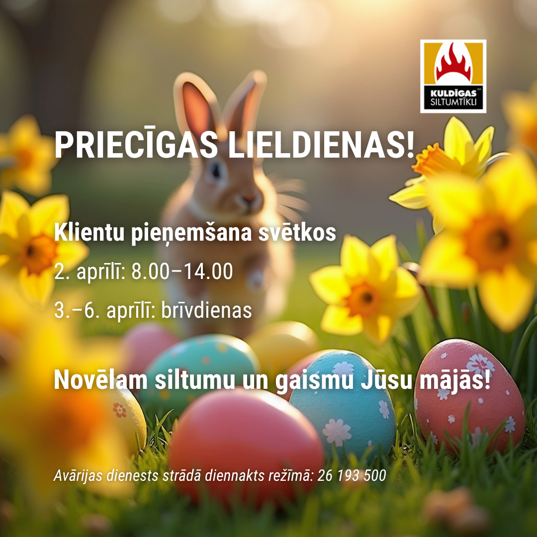 Vēlam siltas un gaišas Lieldienas katrā mājā! Informējam, ka 2. aprīlī klientus pieņemsim no 8.00 līdz 14.00, savukārt no 3. līdz 6. aprīlim būs brīvdienas. Siltumapgādes traucējumu gadījumā diennakts avārijas dienests: 26193500.